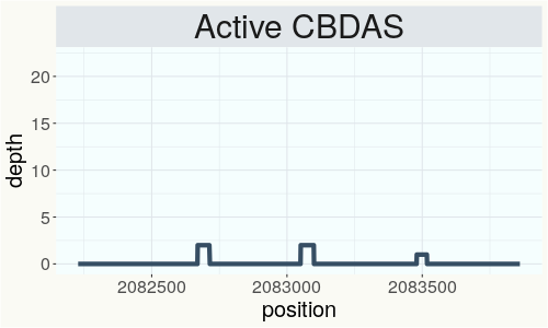 This chart represents the Illumina sequence coverage over the Bt/Bd allele. These are the three regions in the cannabis genome that impact THCA, CBDA, CBGA production. Coverage over the Active CBDAS gene is highly correlated with Type II and Type III plants as described by Etienne de Meijer. Coverage over the THCA gene is highly correlated with Type I and Type II plants but is anti-correlated with Type III plants. Type I plants require coverage over the inactive CBDA loci and no coverage over the Active CBDA gene. Lack of coverage over the Active CBDA and Active THCA allele are presumed to be Type IV plants (CBGA dominant). While deletions of entire THCAS and CBDAS genes are the most common Bt:Bd alleles observed, it is possible to have plants with these genes where functional expression of the enzyme is disrupted by deactivating point mutations (Kojoma et al. 2006).