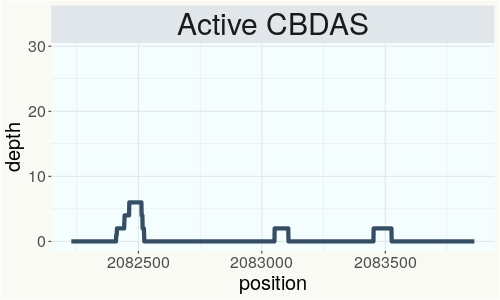This chart represents the Illumina sequence coverage over the Bt/Bd allele. These are the three regions in the cannabis genome that impact THCA, CBDA, CBGA production. Coverage over the Active CBDAS gene is highly correlated with Type II and Type III plants as described by Etienne de Meijer. Coverage over the THCA gene is highly correlated with Type I and Type II plants but is anti-correlated with Type III plants. Type I plants require coverage over the inactive CBDA loci and no coverage over the Active CBDA gene. Lack of coverage over the Active CBDA and Active THCA allele are presumed to be Type IV plants (CBGA dominant). While deletions of entire THCAS and CBDAS genes are the most common Bt:Bd alleles observed, it is possible to have plants with these genes where functional expression of the enzyme is disrupted by deactivating point mutations (Kojoma et al. 2006).