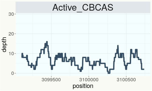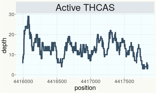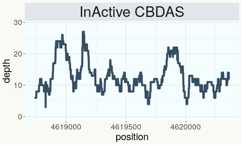 This chart represents the Illumina sequence coverage over the CBCA synthase gene.