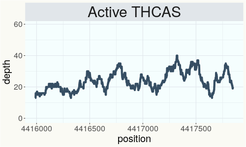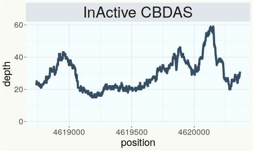 This chart represents the Illumina sequence coverage over the Bt/Bd allele. These are the three regions in the cannabis genome that impact THCA, CBDA, CBGA production. Coverage over the Active CBDAS gene is highly correlated with Type II and Type III plants as described by Etienne de Meijer. Coverage over the THCA gene is highly correlated with Type I and Type II plants but is anti-correlated with Type III plants. Type I plants require coverage over the inactive CBDA loci and no coverage over the Active CBDA gene. Lack of coverage over the Active CBDA and Active THCA allele are presumed to be Type IV plants (CBGA dominant). While deletions of entire THCAS and CBDAS genes are the most common Bt:Bd alleles observed, it is possible to have plants with these genes where functional expression of the enzyme is disrupted by deactivating point mutations (Kojoma et al. 2006).