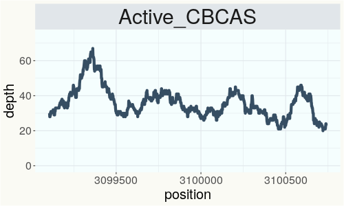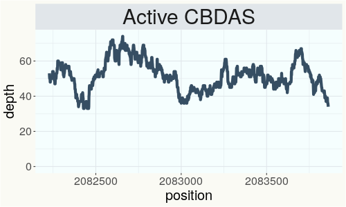 This chart represents the Illumina sequence coverage over the CBCA synthase gene.