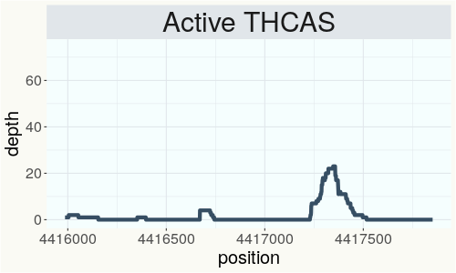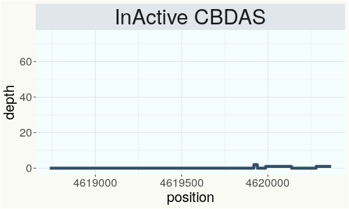 This chart represents the Illumina sequence coverage over the Bt/Bd allele. These are the three regions in the cannabis genome that impact THCA, CBDA, CBGA production. Coverage over the Active CBDAS gene is highly correlated with Type II and Type III plants as described by Etienne de Meijer. Coverage over the THCA gene is highly correlated with Type I and Type II plants but is anti-correlated with Type III plants. Type I plants require coverage over the inactive CBDA loci and no coverage over the Active CBDA gene. Lack of coverage over the Active CBDA and Active THCA allele are presumed to be Type IV plants (CBGA dominant). While deletions of entire THCAS and CBDAS genes are the most common Bt:Bd alleles observed, it is possible to have plants with these genes where functional expression of the enzyme is disrupted by deactivating point mutations (Kojoma et al. 2006).